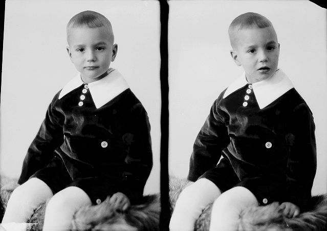 Liten gutt, mørk drakt med lys krage, sittende, halvfigur