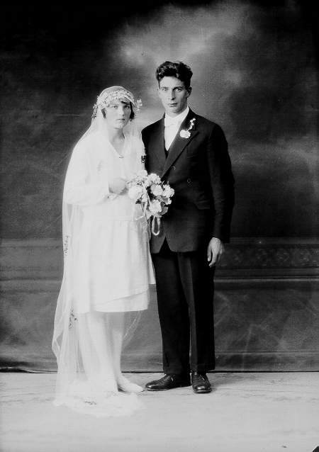 Brudebilde, 1, kvinne, lys kjole og slør, brudebukett, 2, mann, mørk dress, begge stående, helfigur