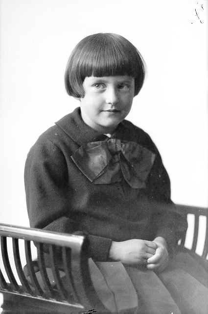 Jente, mørk genser og skjørt, sittende på stol, halvfigur