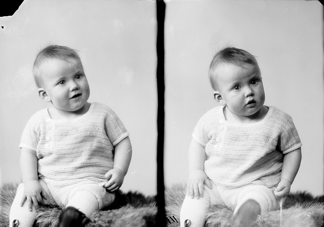 Liten gutt, lys trøye og bukse, sittende på skinnfell, halvfigur