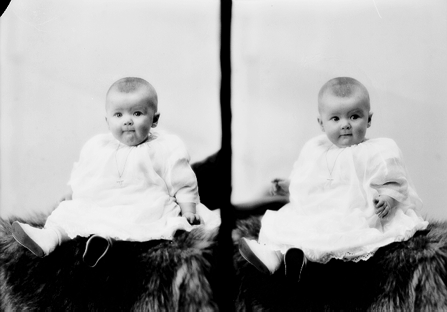 Liten jente, lys kjole, sittende på skinnfell, helfigur