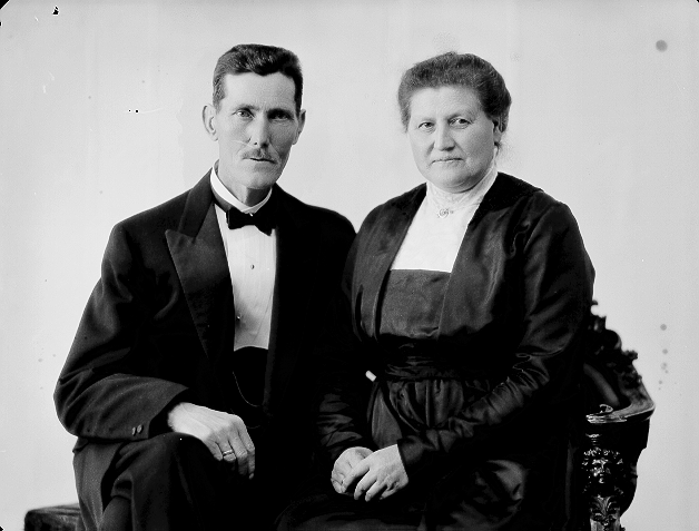 Par, 1, mann, bart, mørk dress, 2, kvinne, mørk kjole, begge sittende, halvfigur