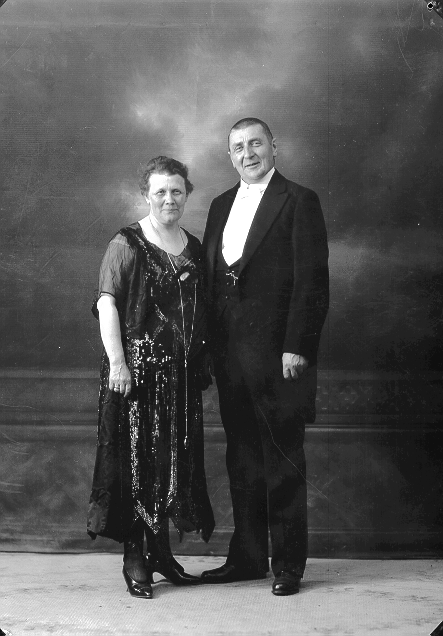 Par, 1, kvinne, mørk mønstret kjole, 2, mann, kjole og hvitt, begge stående, helfigur