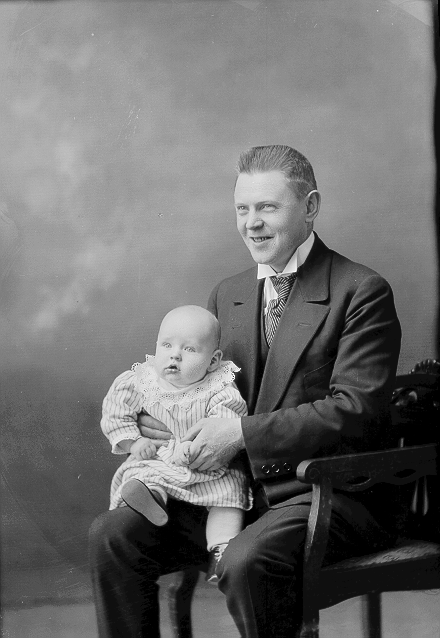 Far og barn, 1, lite barm, lys stripete kjole, sittende på fars kne, helfigur, 2, mann, mørk dress, sittende på stol, halvfigur