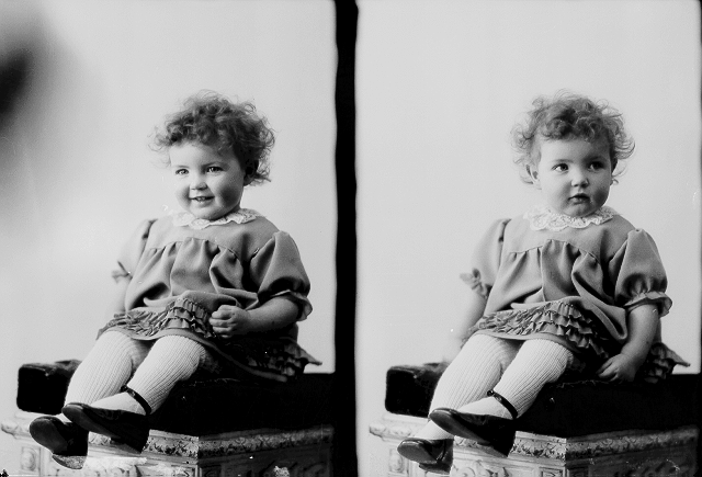Liten jente, grå kjole, sittende, helfigur