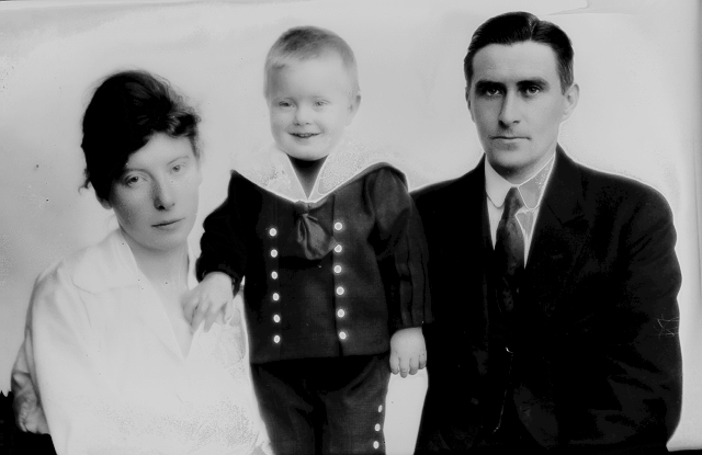 Familiegruppe, 1, kvinne, lys bluse, 2, gutt, mørk matrosdress, 3, mann, mørk dress, alle halvfigur