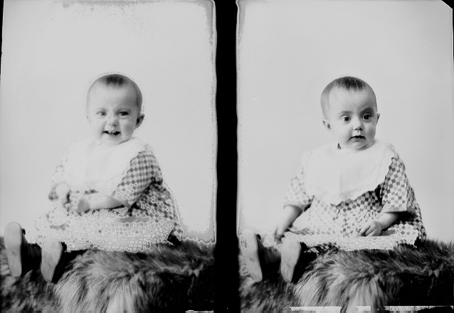 Liten jente, rutete kjole med lys krage, sittende på skinnfell, helfigur