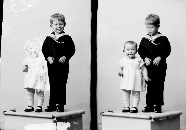 Søskenpar, 1, liten jente, lys kjole, 2, gutt, mørk matrosdress, begge stående, helfigur