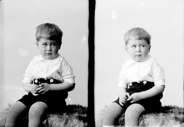 Gutt, lys trøye, mørk kortbukse, sittende på skinnfell, halvfigur