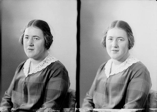 Kvinne, mørk mønstret kjole med lys krage, halvfigur