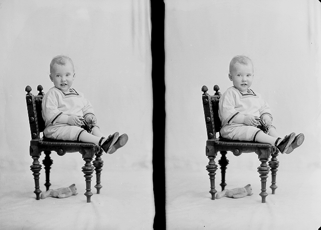 Liten gutt, lys drakt, sittende på stol, helfigur