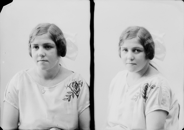Ung kvinne, lys kjole og hårsløyfe, halvfigur
