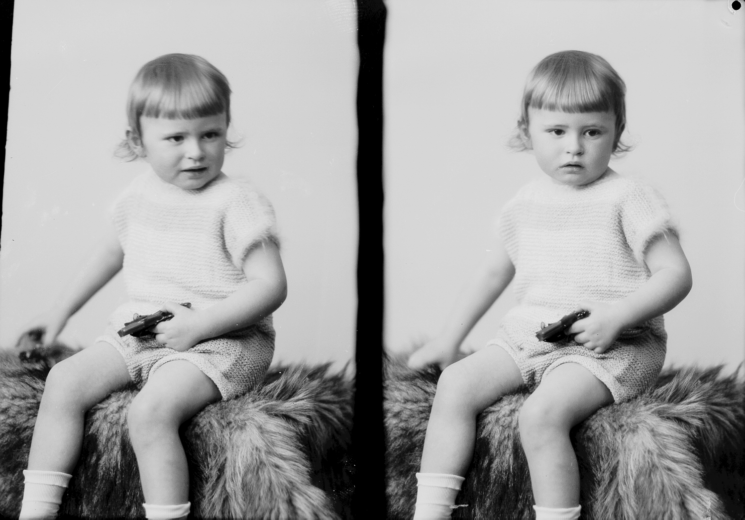 Liten gutt, lys drakt, sittende på skinnfell, halvfigur