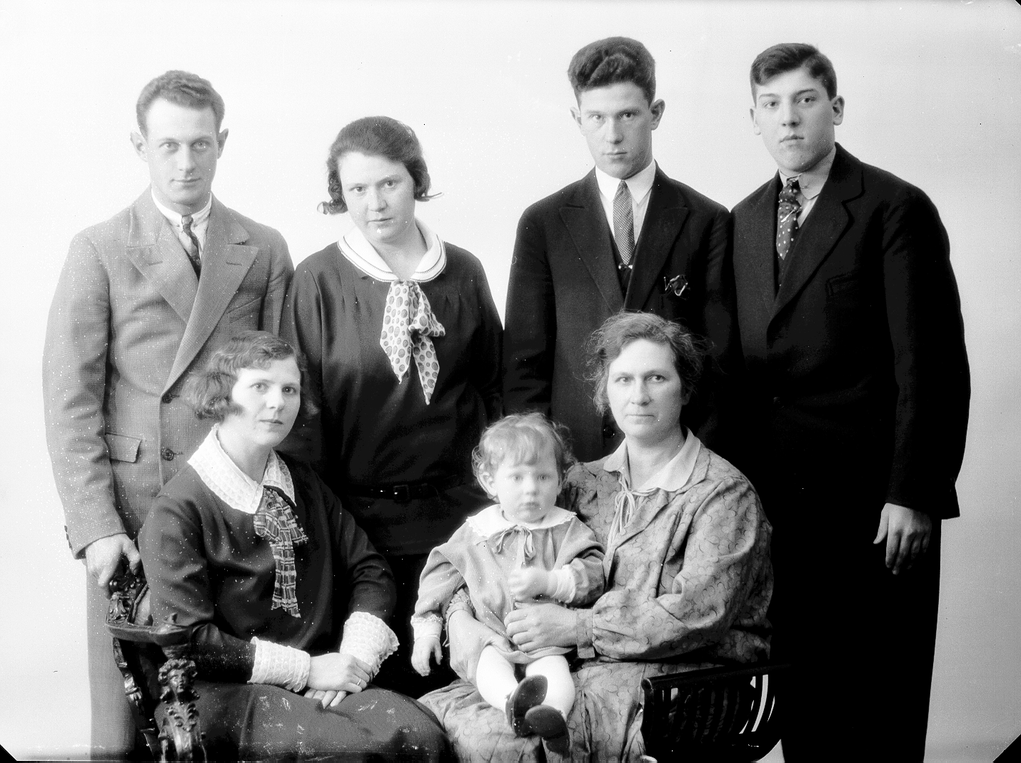 3 damer, 3 menn, 1 barn, halvfigur