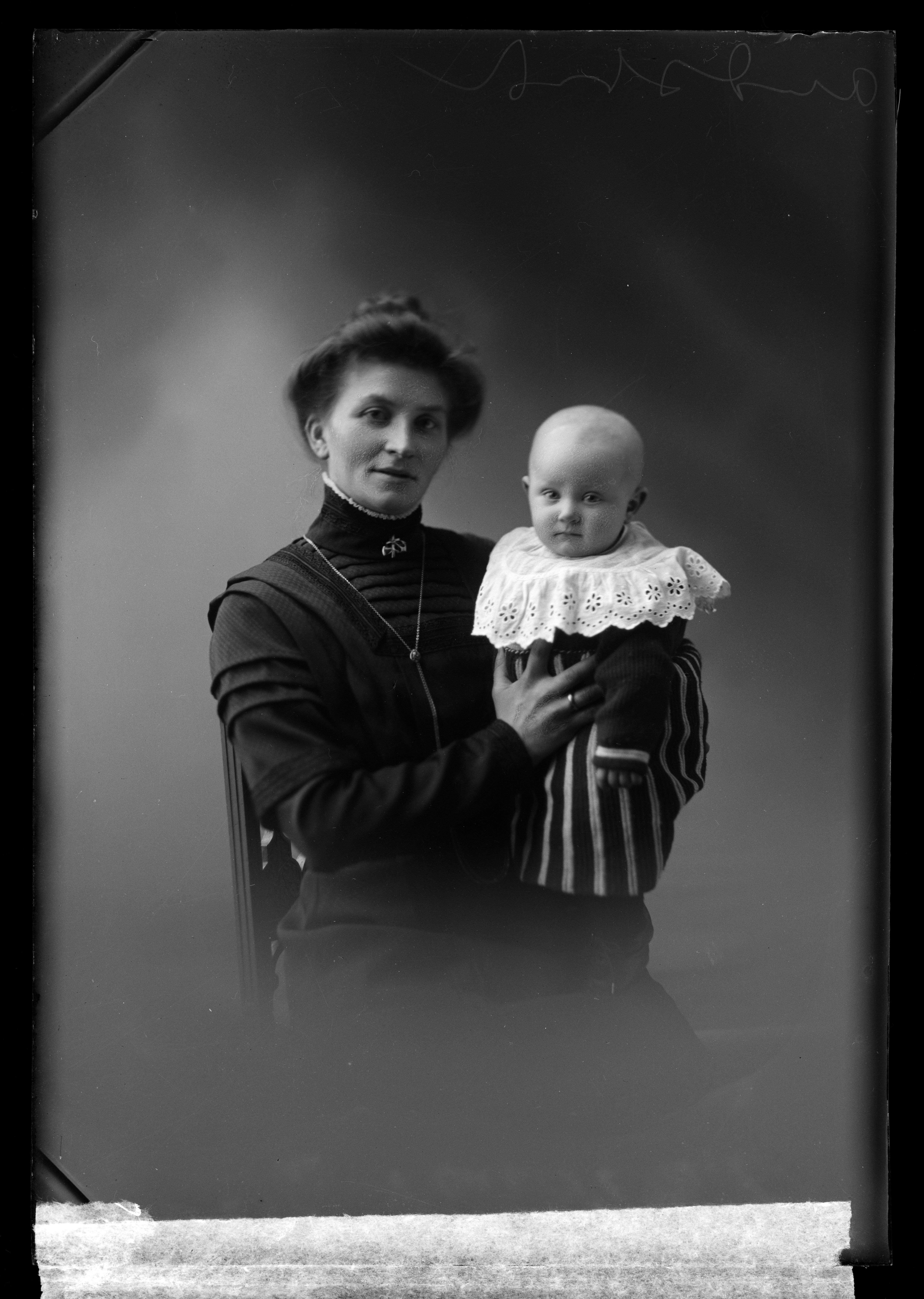 dame sittende barn blondekrage strikkekjole smykke brosje