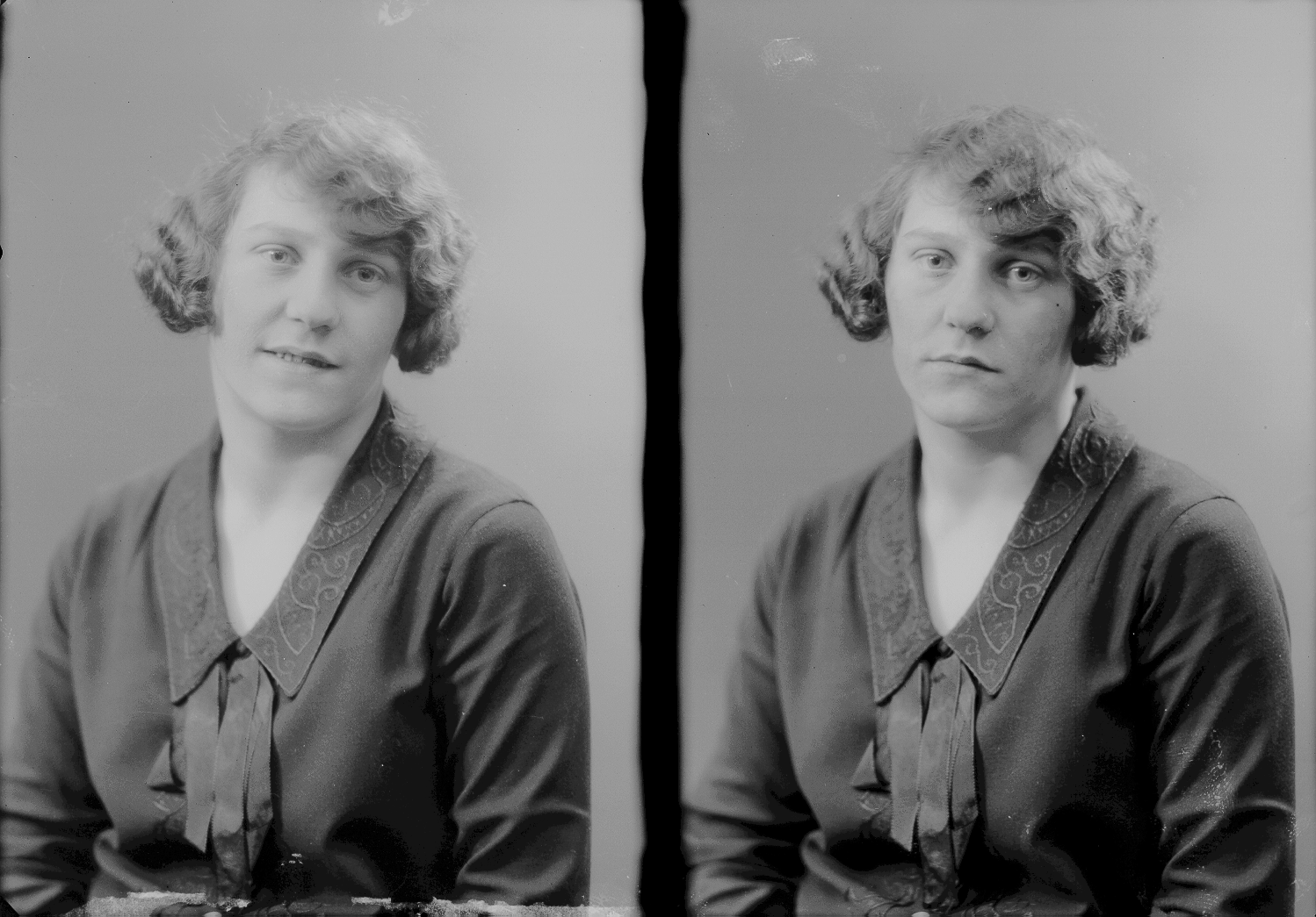 Dame. Hårfrisyre. Broderi. Halvfigur