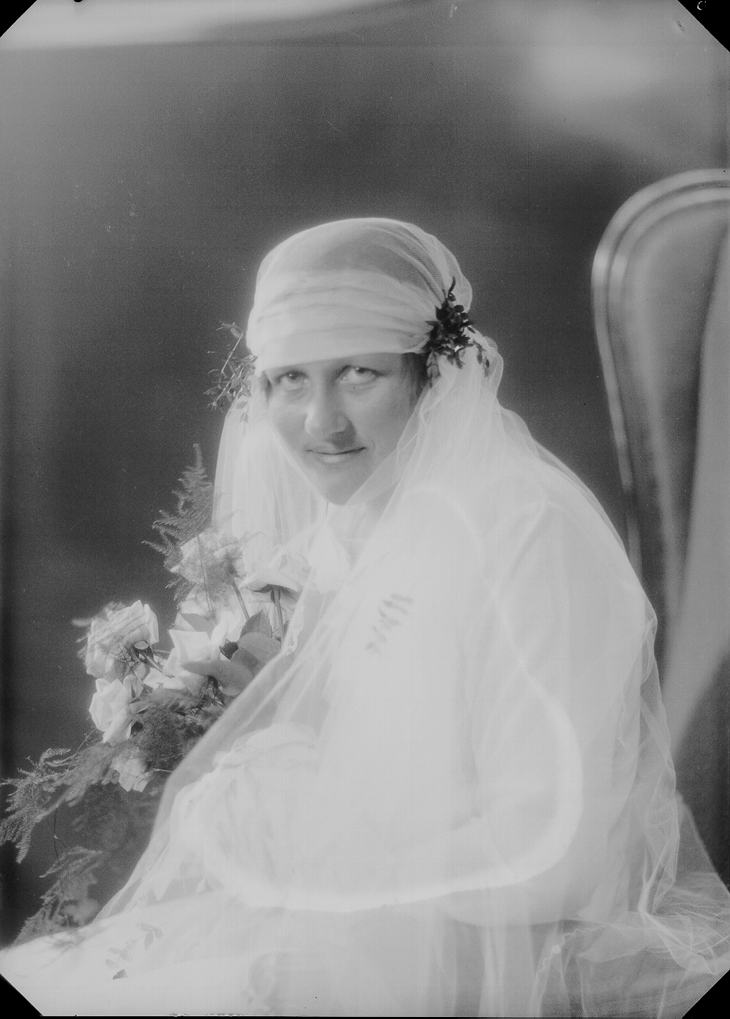 Brud, halvfigur, slør, brudebukett