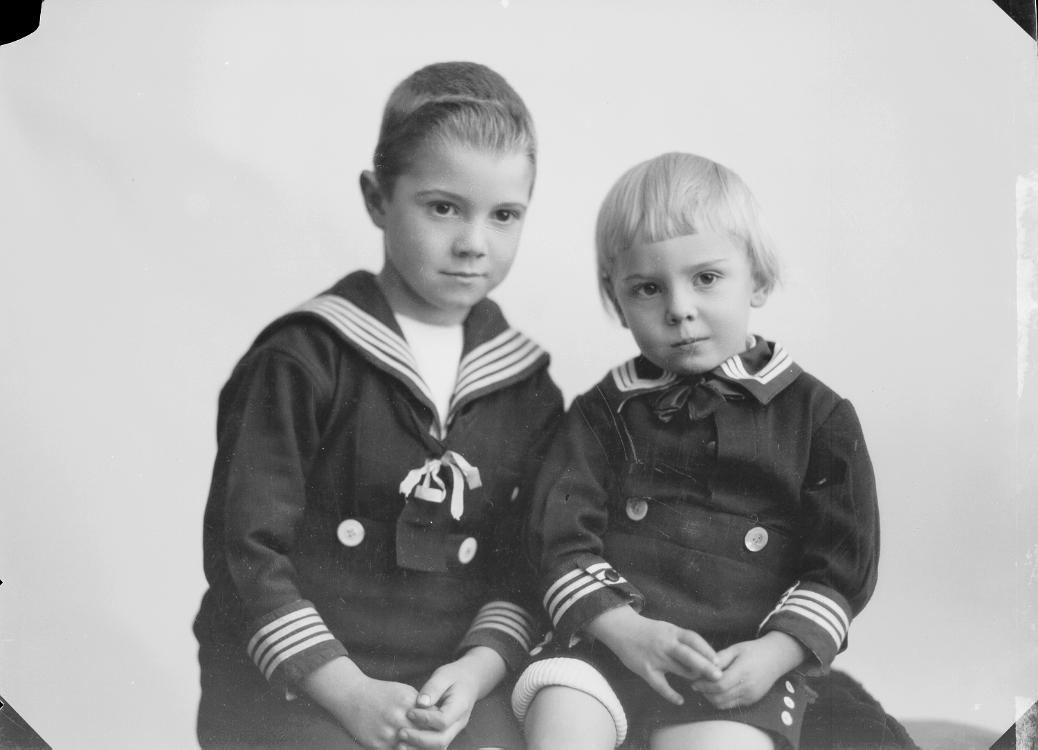 Søskenpar, to gutter, mørke matrosdresser, sittende, halvfigur, (TH til