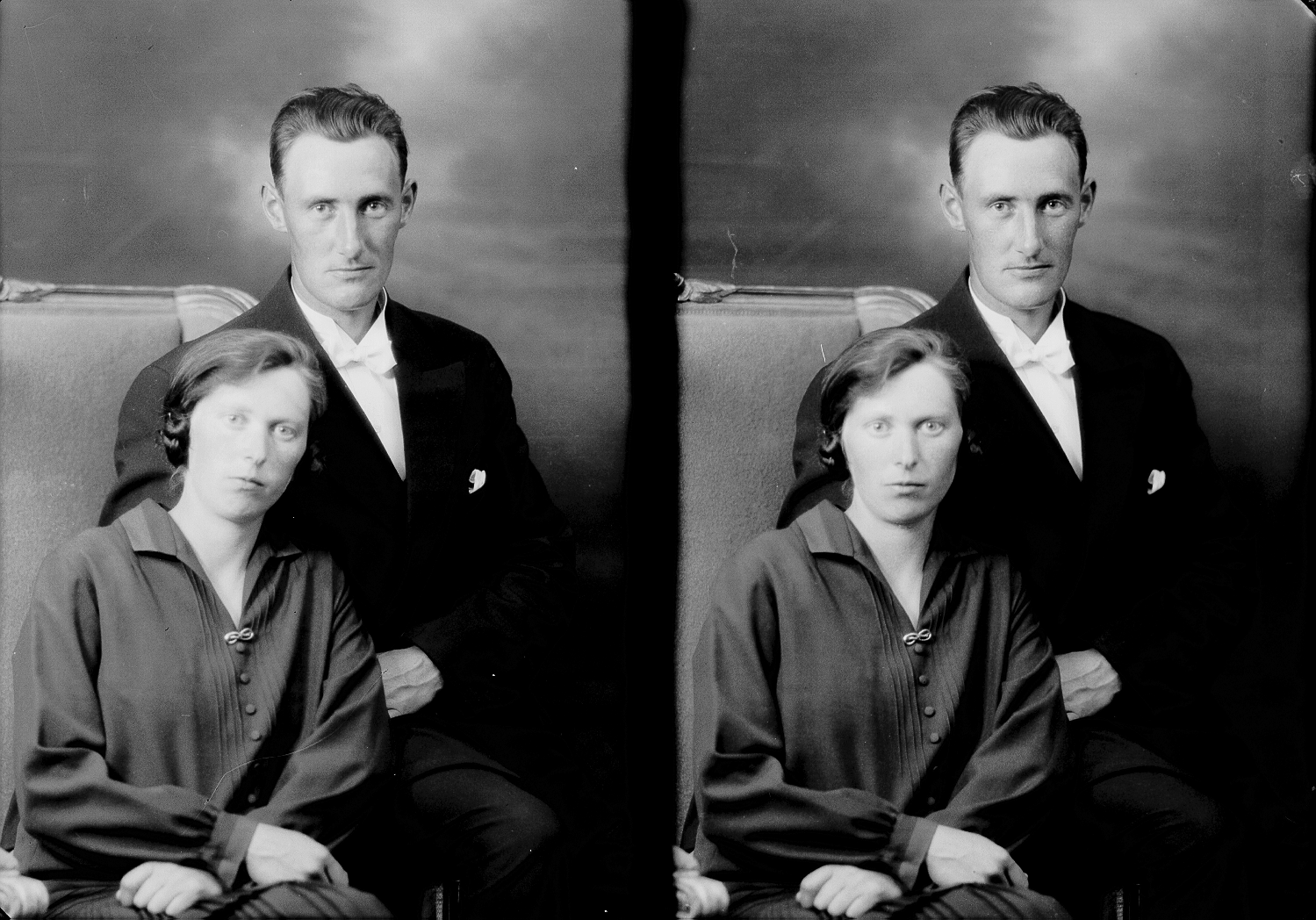 Par, 1, kvinne, grå bluse og skjørt, sittende i stol, 2, mann, mørk dress,