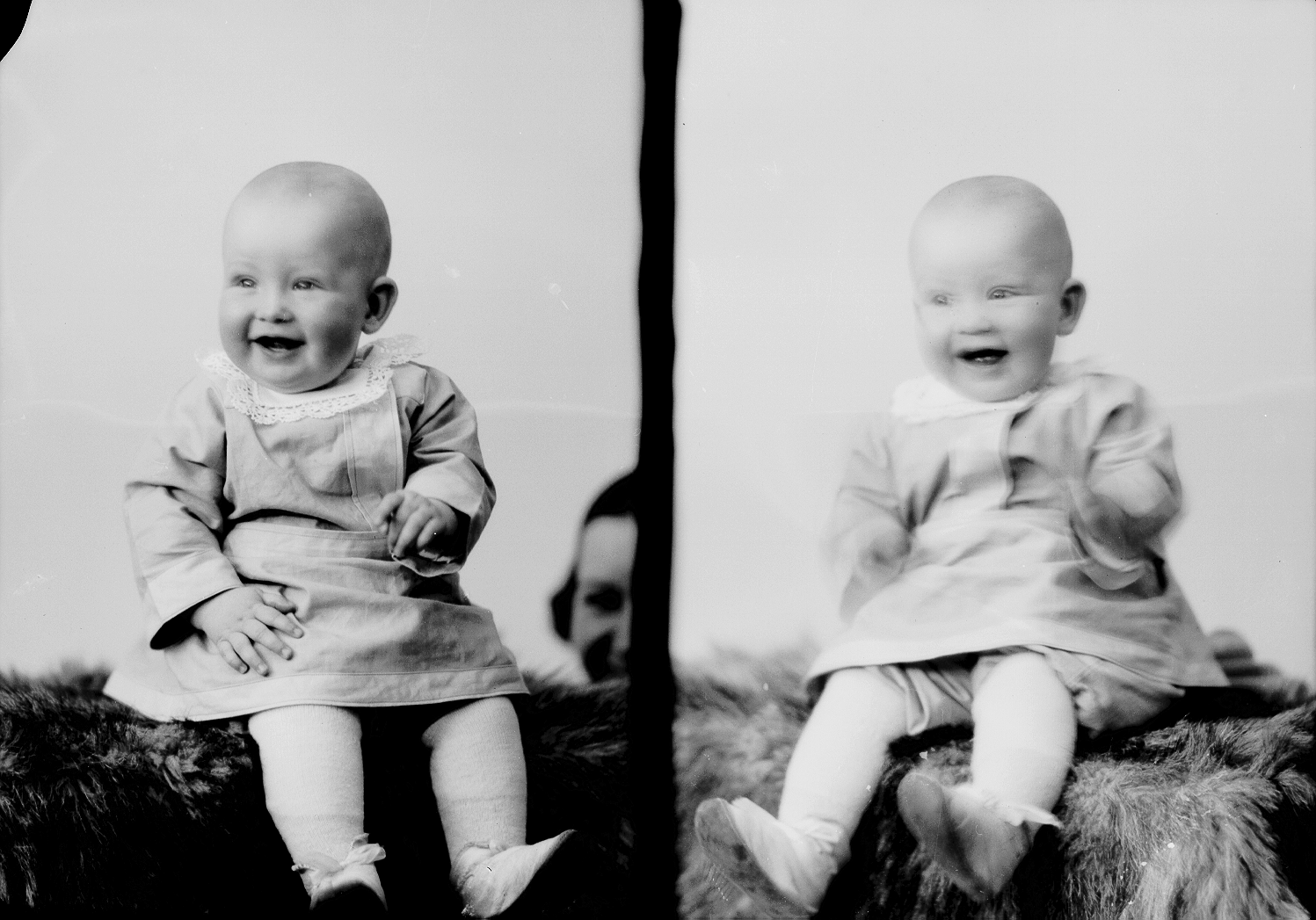 Liten gutt, lys kjole, sittende på skinnfell, helfigur
