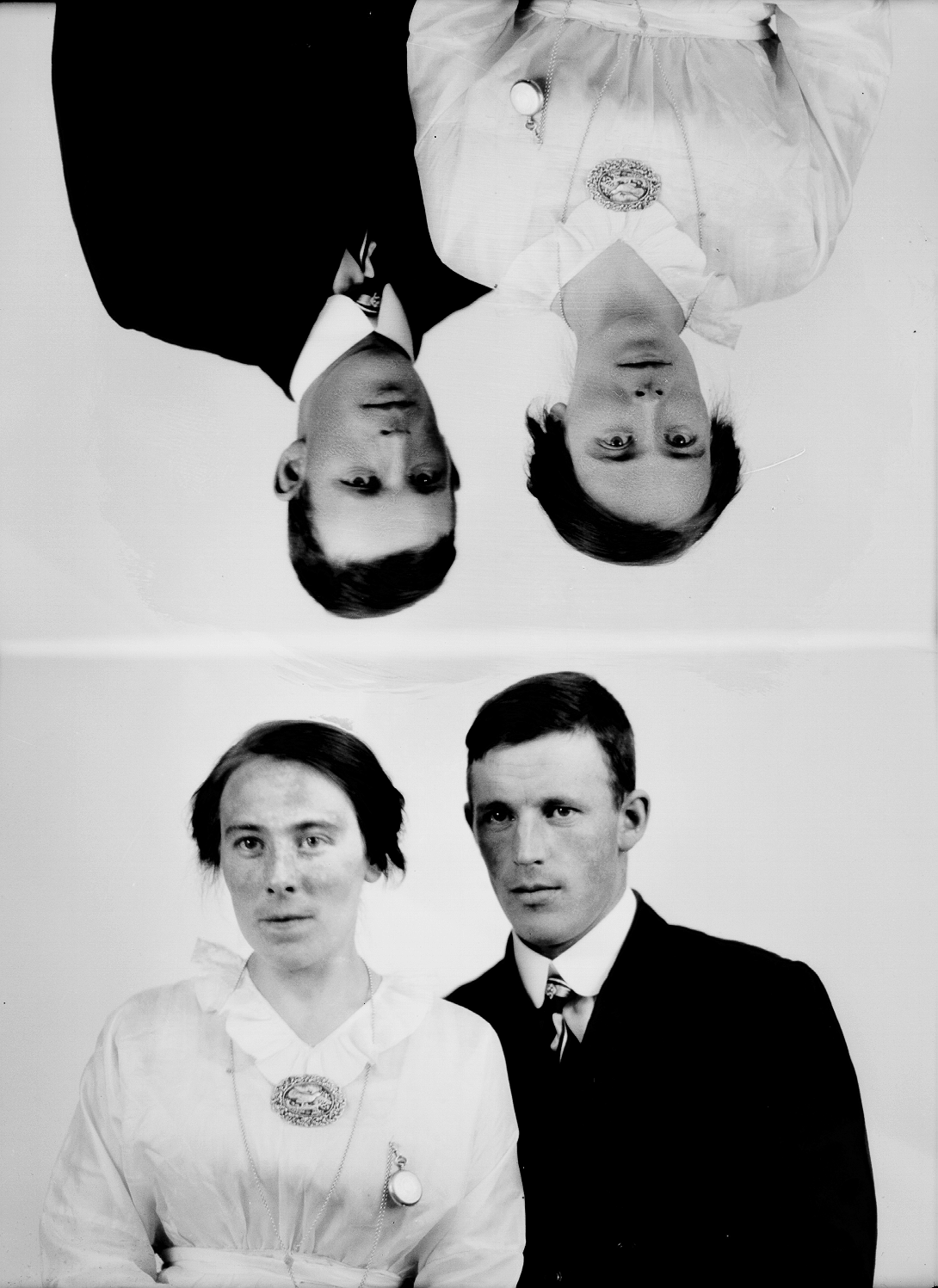 Ektepar, 1, kvinne, lys kjole, brosje, 2, mann, mørk dress, begge halvfigur.