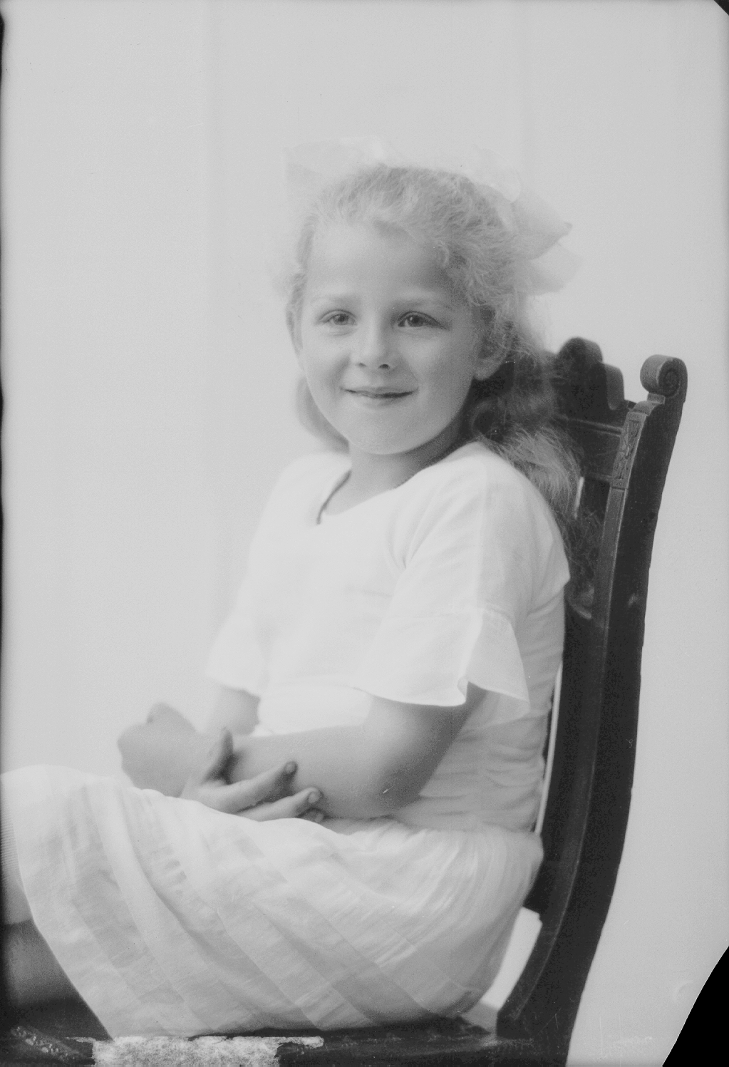 jente sittende på stol, helfigur, hårsløyfe