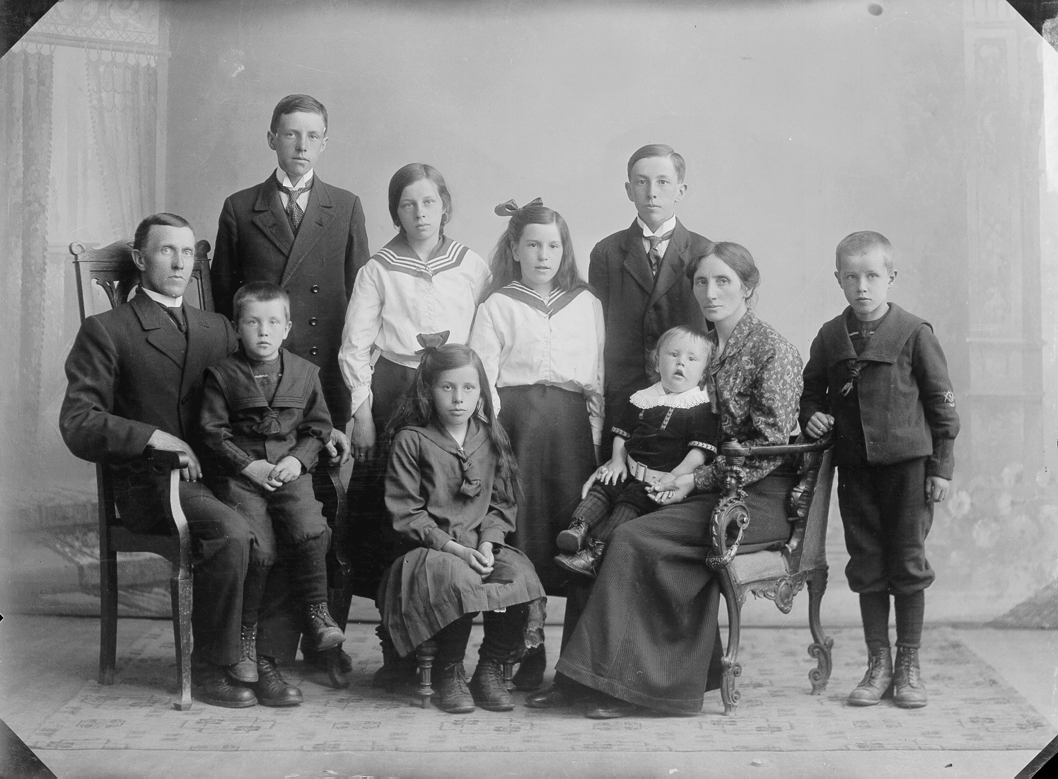 Mor. Far. 3 døtre. 5 sønner. Matroskjole. Barneklær. Beltespenne. Helfigur