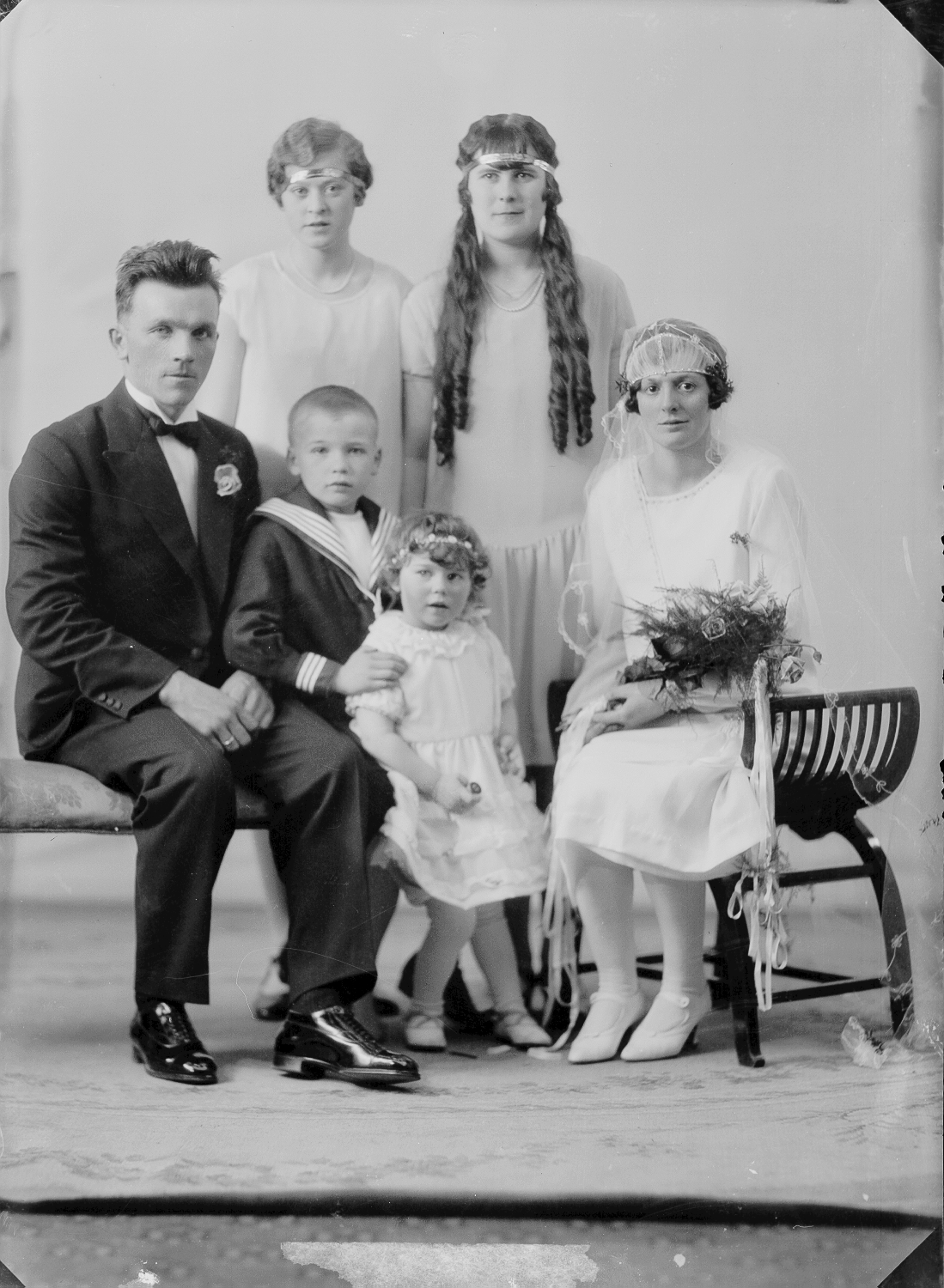 Portrett av brudeparet Krogstad m/brudepiker og brudesvenn