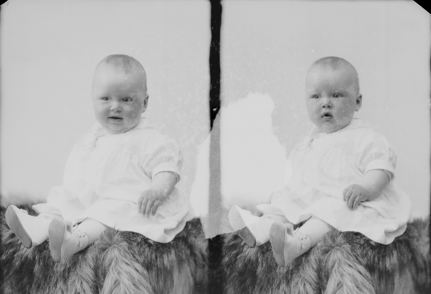baby sittende på skinnfell, helfigur