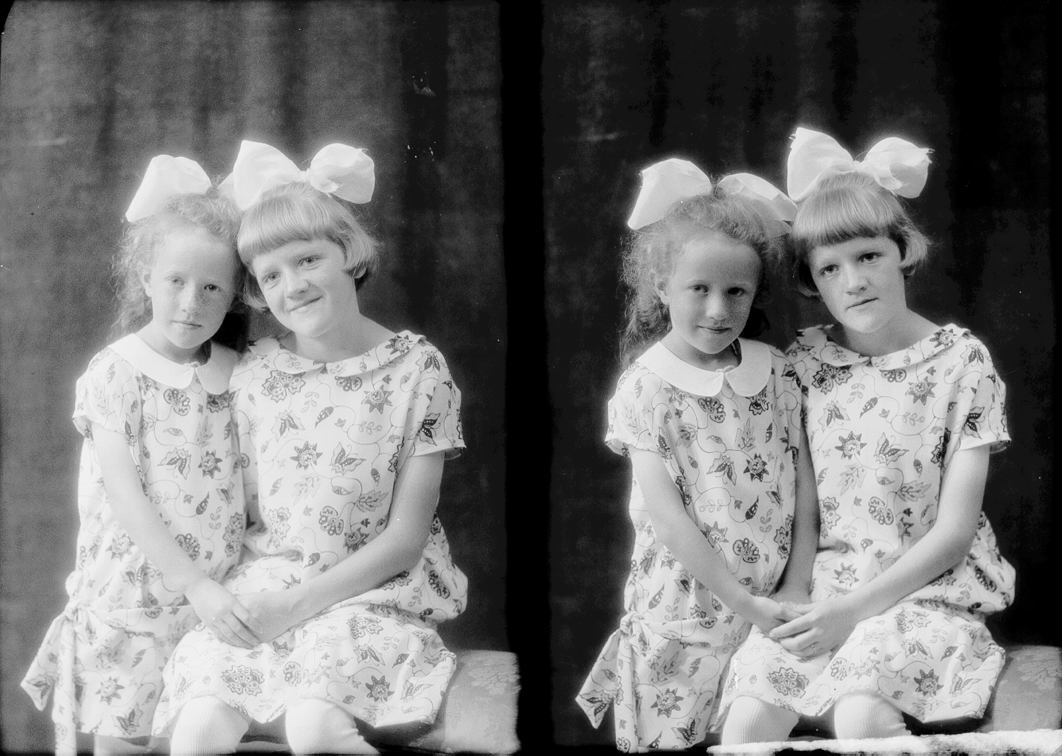 2 jenter. Barneklær. Barnekjole. Belte. Magebelte. Halvfigur