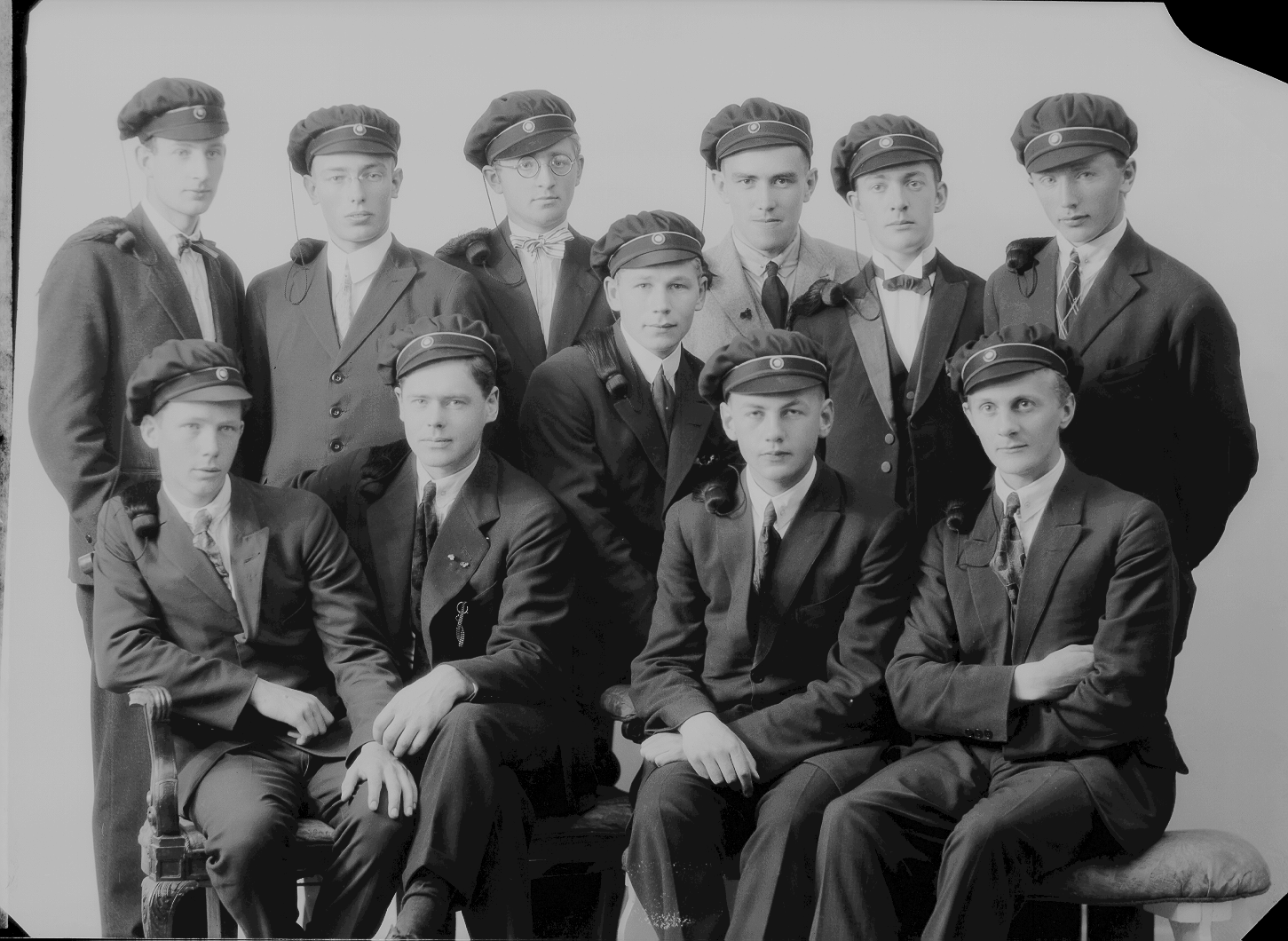 gruppe, 11 studenter, elever, 11 menn, halvfigur, studentlue