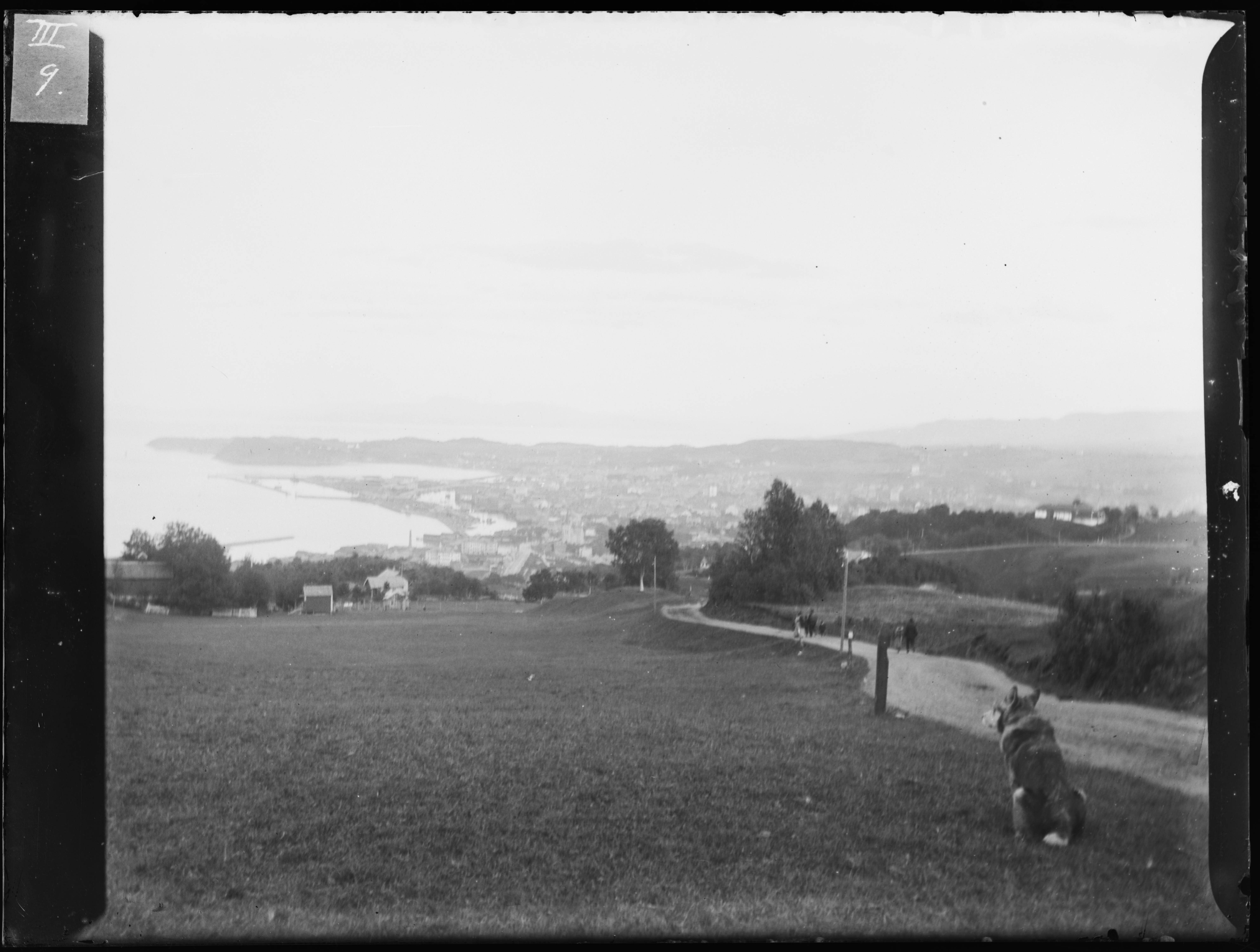 Bymarka. Trondheim sett fra Gramskaret. En hund sitter i forgrunnen, Møllebakken til høyre. Marienberg gård ca midt i bildet til høyre.