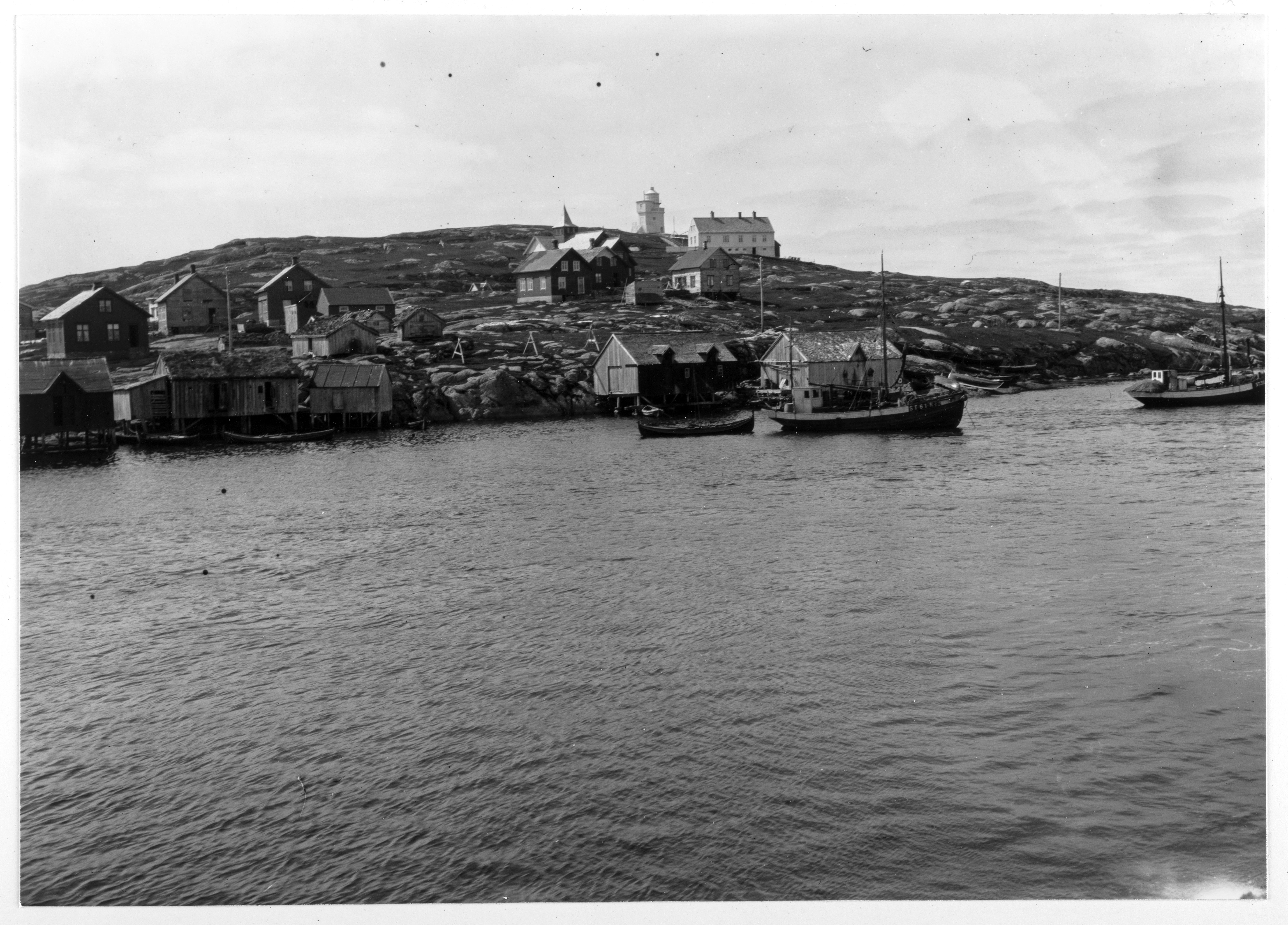 Fra Sula i Fosen. Brygger og sjøhus i strandkanten, lengre opp på svabergene, bolighus. Øverst ligger Sula fyr. I havna, flere fiskebåter. Den ene båten har registreringsnr. ST-61-RF.