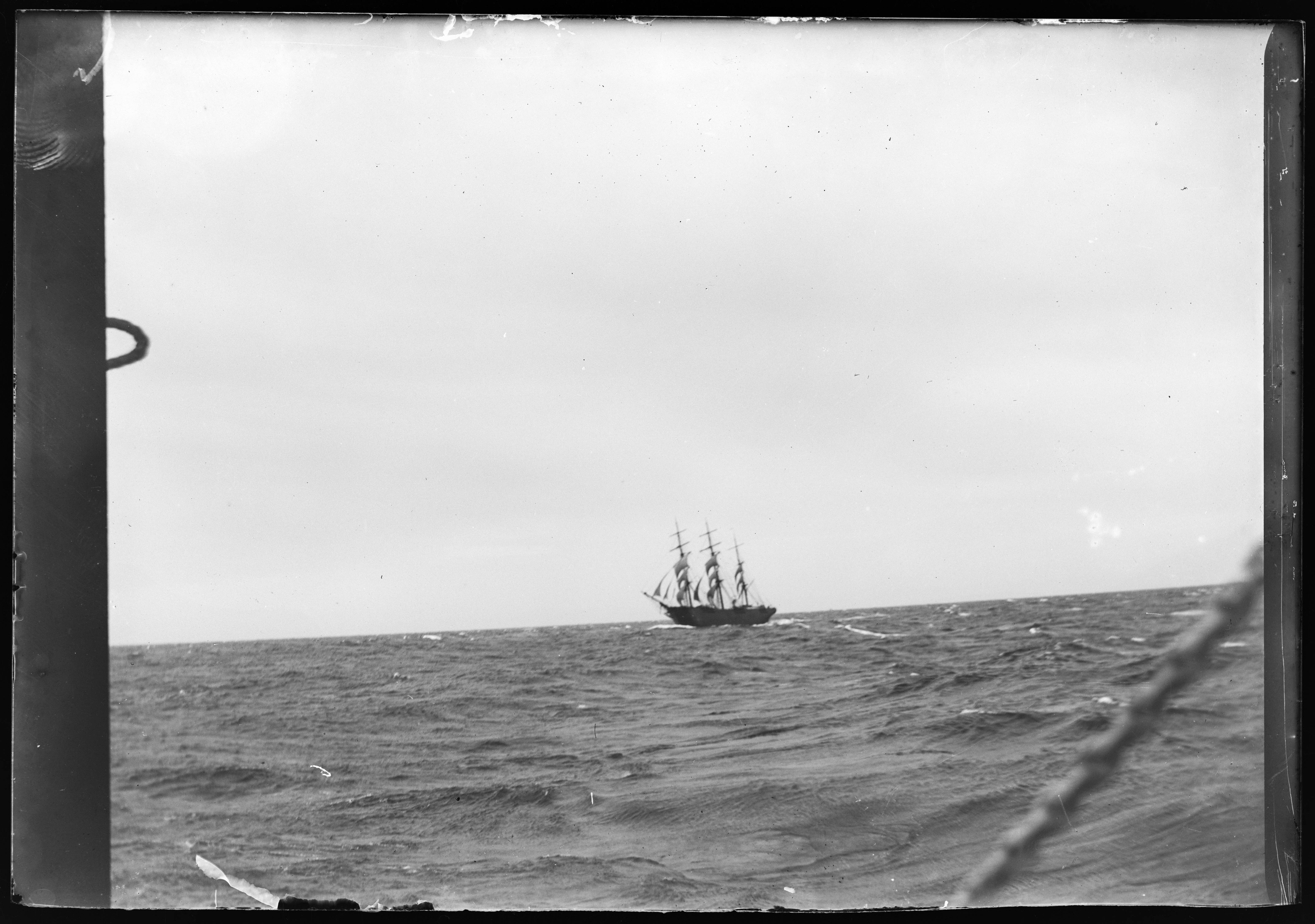 Bildet er tatt fra skoleskipet Tordenskiold og utover havet. I horisonten sees en fullrigger som ligger bidevind og med fastgjorte bromseil