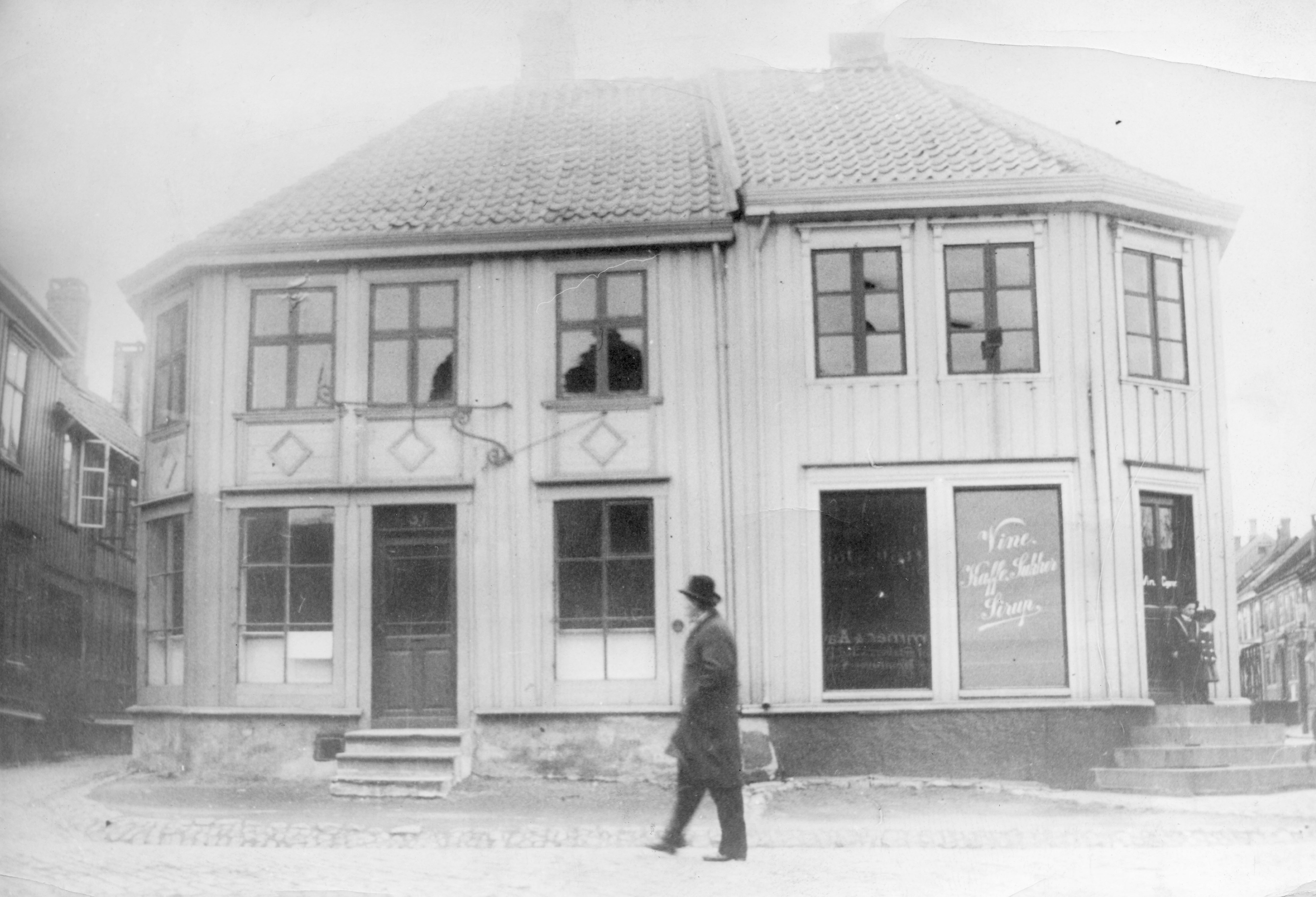 2 bygårder liggende på hjørnet av Fjordgata og Jomfrugata. Skrataasgården til venstre og Kriebelgården til høyre. På trappa til høyre står en liten gutt og pike i matrosklær. Reklame på vinduet for Vine, Kaffe, Sukker, Sirup. Sladrespeil.