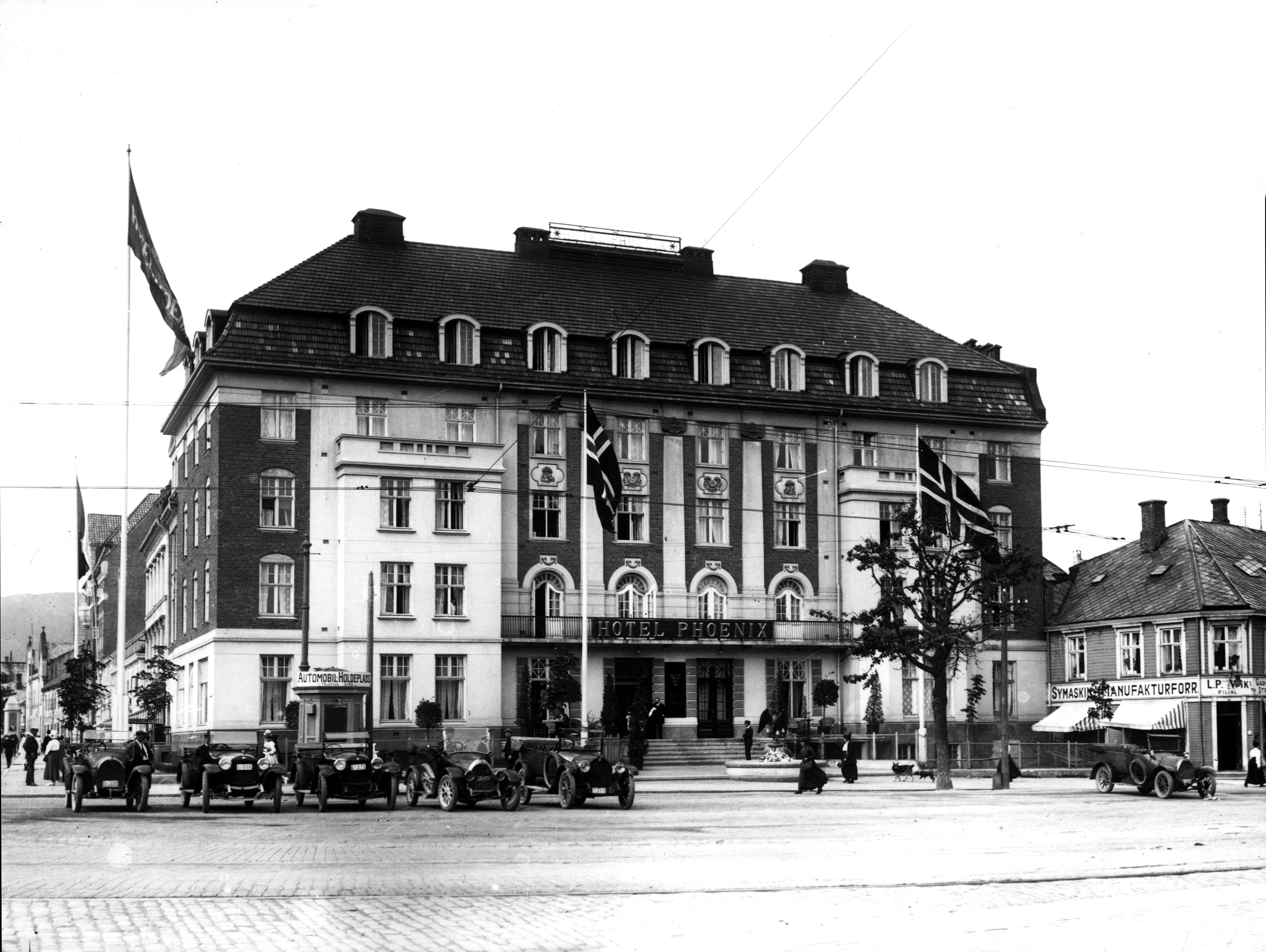 Hotell Phoenix i Munkegata 26-28. Bygningen til høyre, L. P. Wik, har adresse Munkegata 30-32. Til venstre ser vi bortover Kongens gate. Foran hotellet er det drosjeholdeplass og mange biler.