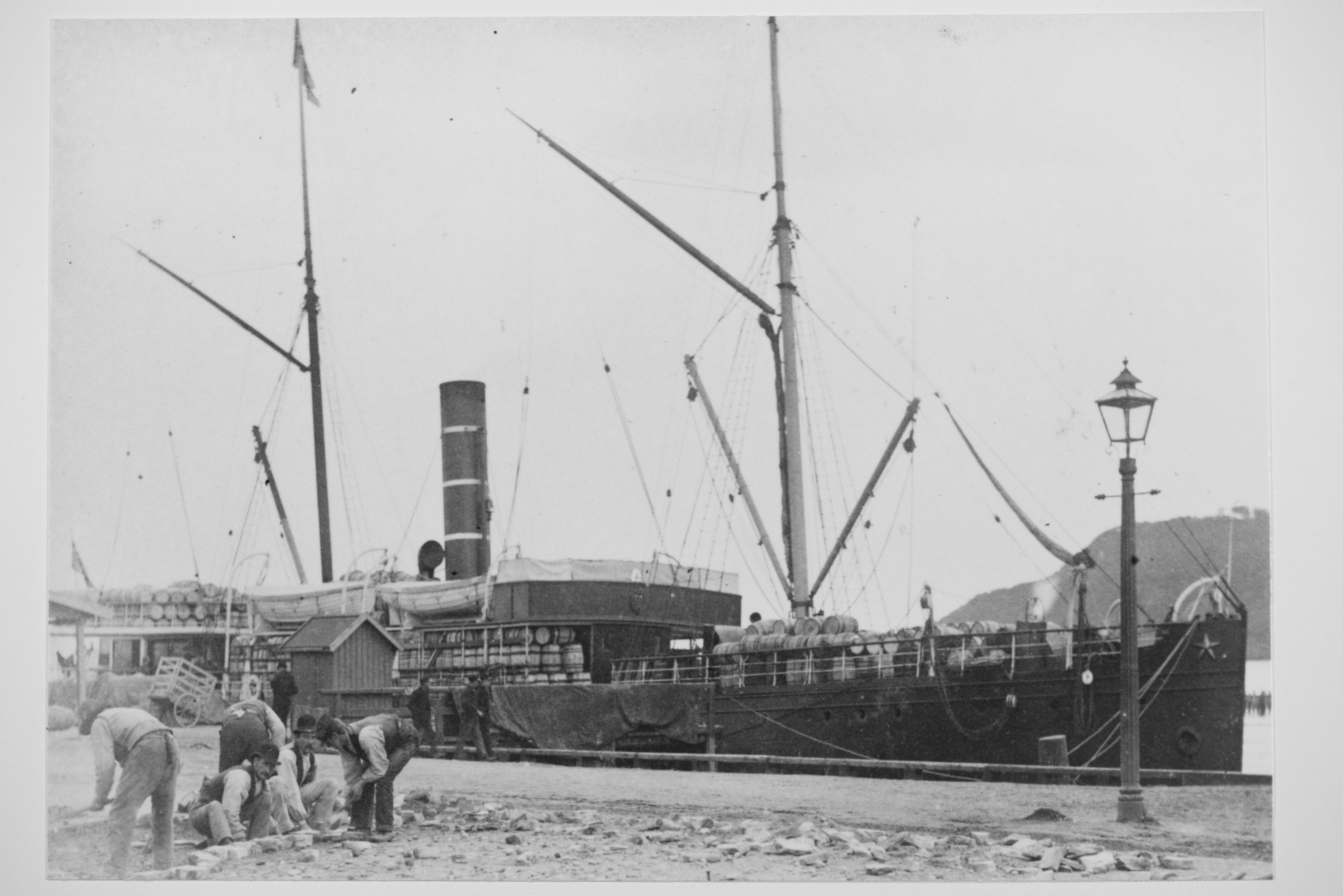 Brattøra, langt ned i elvehavna. En båt fra Det Bergenske Dampskibsselskab BDS ligger til kai. Båten er muligens D/S Juno ex. John Schøning. I forgrunnen til venstre, arbeider endel karer. Bilde 45 i album fra Jørgen Wickstrøm.